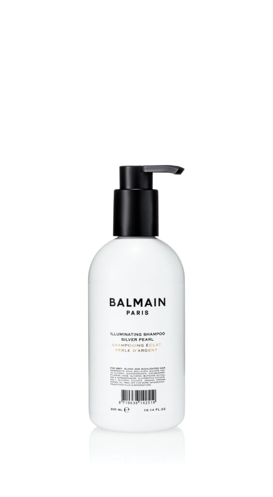 Shampooing éclat Silver Pearl de Balmain Hair, enrichi en pigments violets, nettoie en douceur tout en neutralisant les reflets jaunes ou cuivrés indésirables.